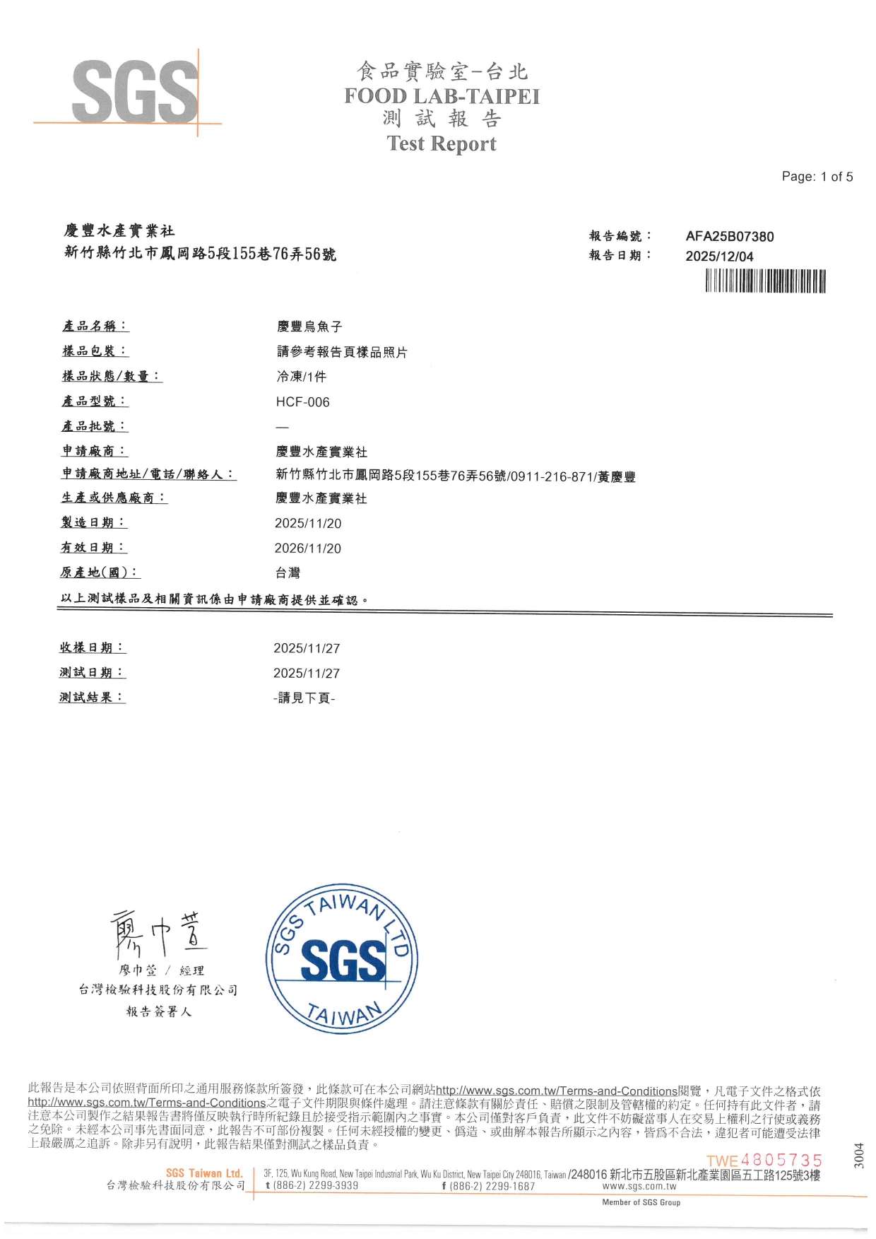 慶豐烏魚子-SGS檢驗報告